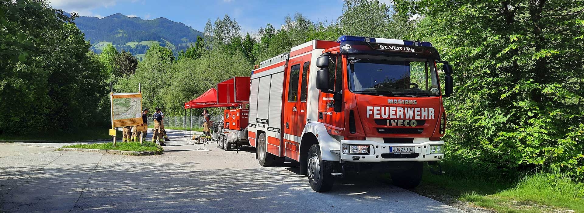 Eine großangelegte Alarmübung der Pongauer Feuerwehren fand am Samstag auf der Kinderalm in St. Veit statt. Angenommen wurde der Brand einer Klosterzelle im Kloster Maria im Paradies, der sich durch die steile Hanglage auf eine darüberliegende Zelle und schließlich auch auf den angrenzenden Wald ausbreitete. An der aufwendig inszenierten Übung, die von der Feuerwehr St. Veit organisiert und geleitet wurde, waren sämtliche Feuerwehren des Abschnitts 2 Pongau (Salzachtal), das Rote Kreuz und die Polizei mit insgesamt 182 Einsatzkräften und 33 Fahrzeugen beteiligt. Geschminkte Statisten der Theatergruppe St. Veit und der umfangreiche Einsatz von Kunstnebel trugen wesentlich zur realistischen Gestaltung bei.
